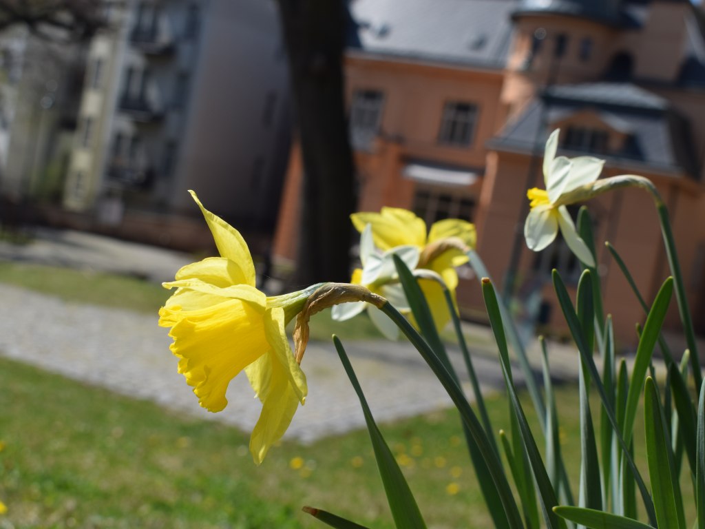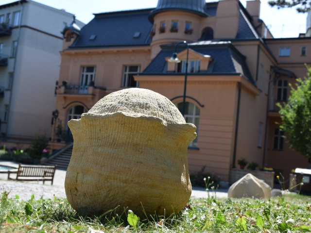 Trávník v zahradě vily se stal v červenci 2022 výstavní plochou pro pískovcové skulptury amatérských sochařů.