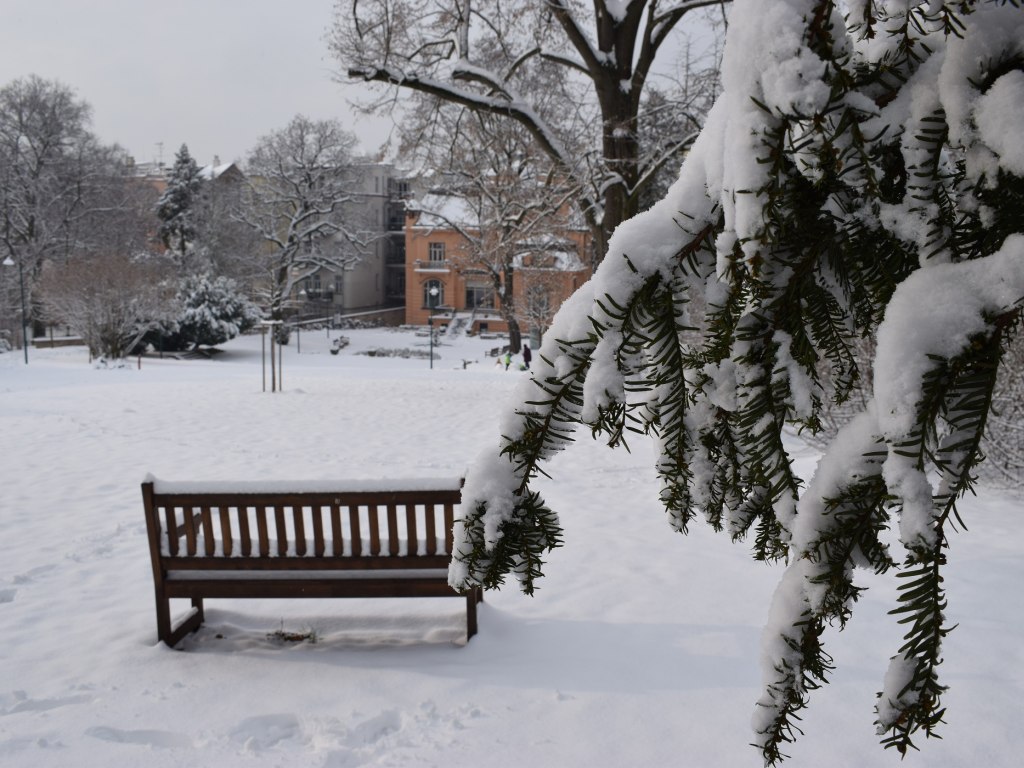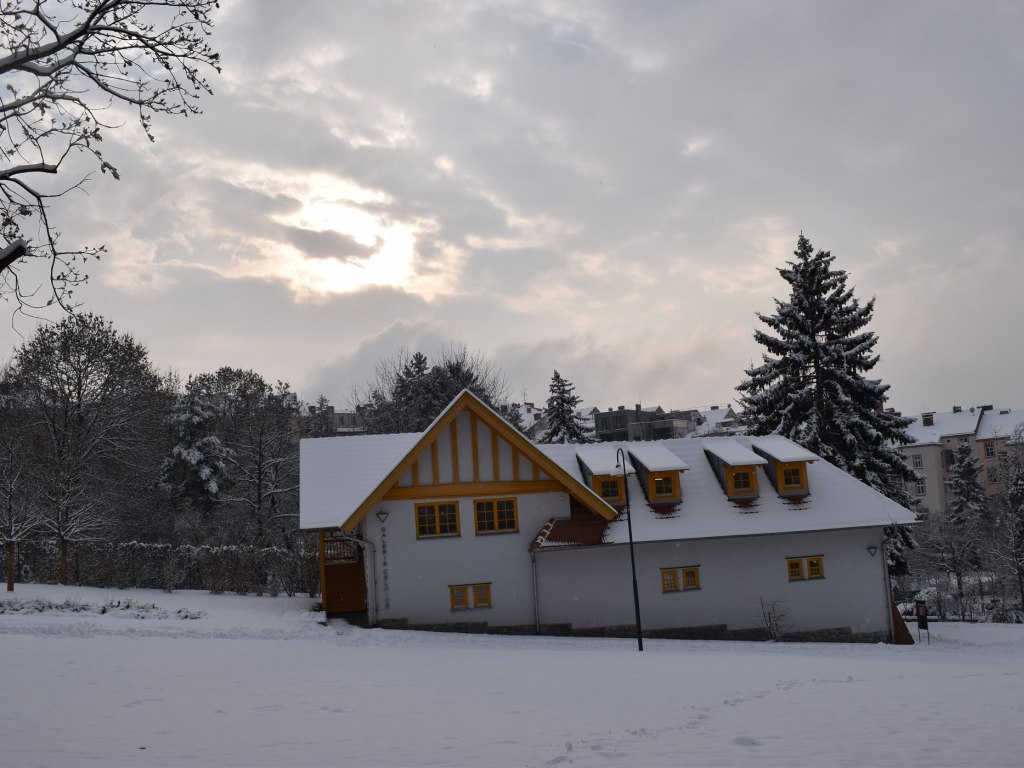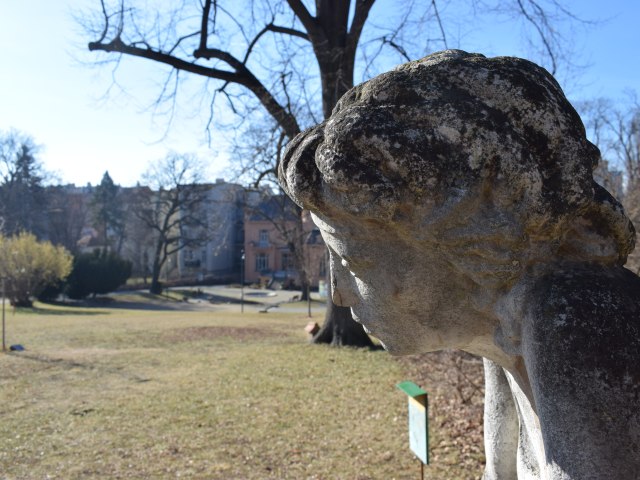 Zima 2022/2023 ve vile Löw-Beer se vydařila: Socha Cvičenka s pořádnou sněhovou čepicí, jehličnany obtěžkané bílou nadílkou, kmeny stromů oblepené sněhem...